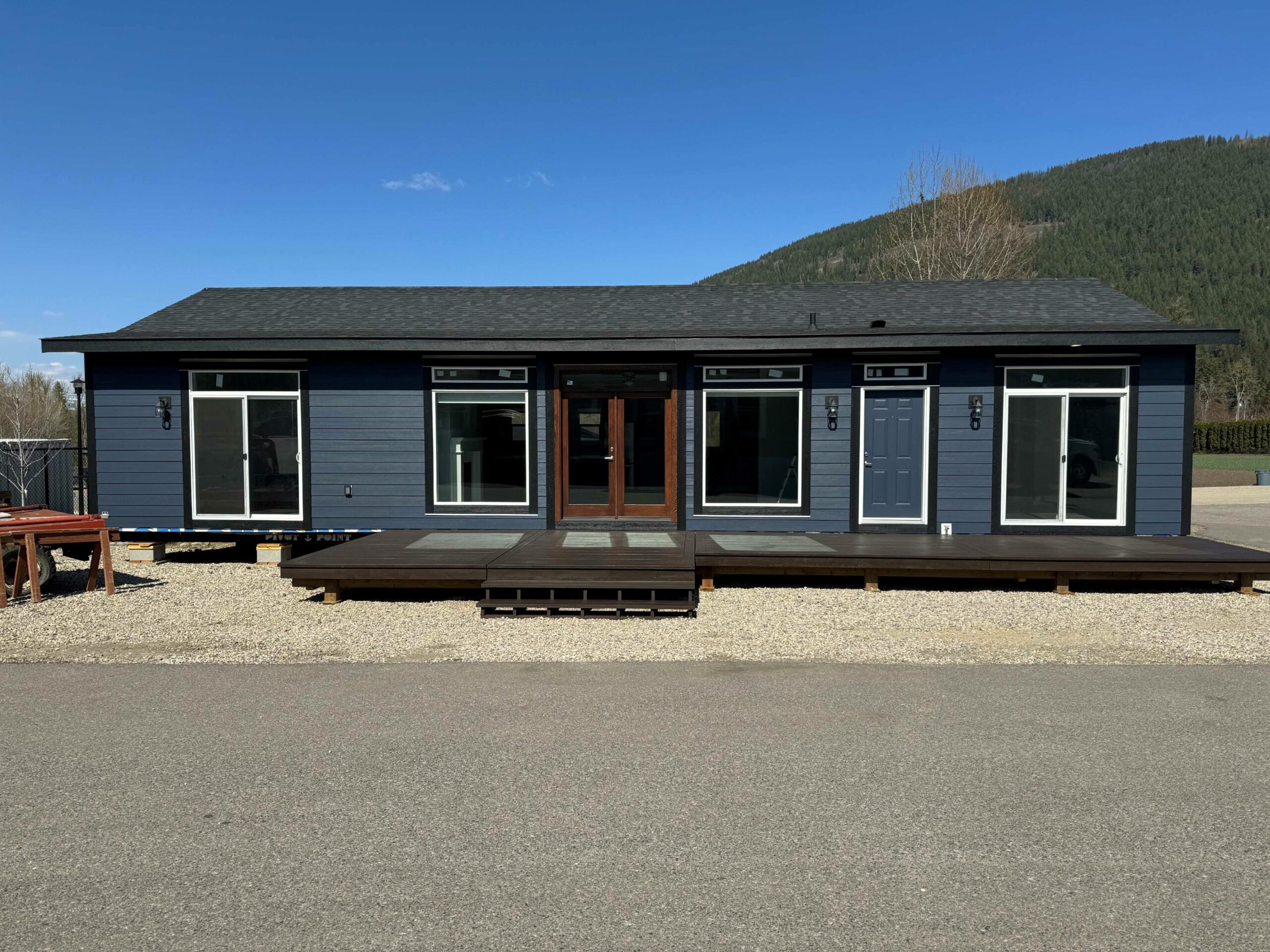 This Custom Design home is located in Osprey Manufactured Home Park in Pritchard, BC. This is a 27′ x 60′ home with 3 bedrooms and 2 bathrooms. The exterior is black and grey and interior has vaulted ceilings.
